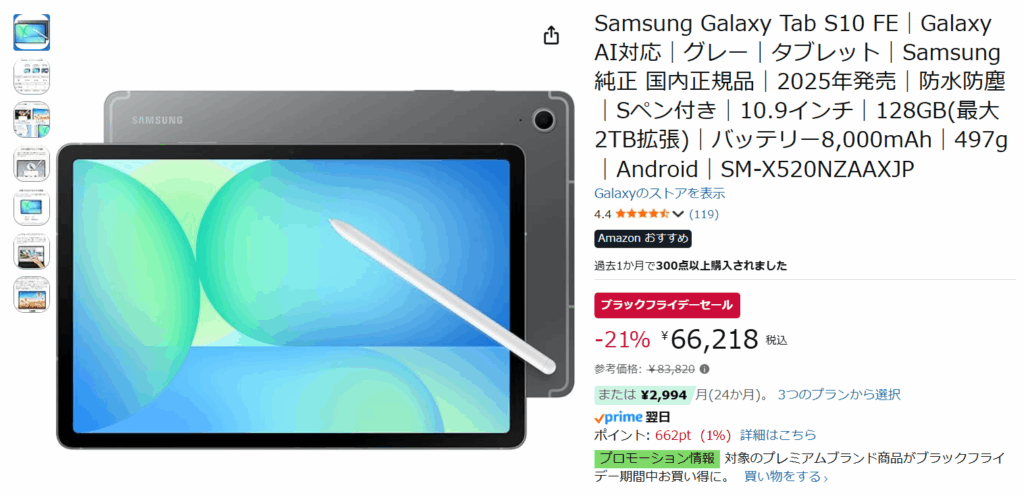 Samsung社のミドルレンジタブレット『Galaxy Tab S10 FE』が、Amazonにてブラックフライデーセール価格になっているので、ご紹介です。 公式価格 83,820円(税込)のGalaxy Tab S10 FEが、21%OFFの66,218円(税込)。 リンク ブラックフライデーセールで、Amaz... -