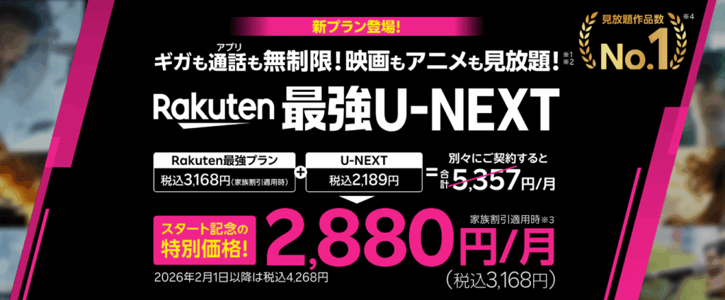 【ギガ無制限で映画アニメ見放題】Rakuten最強U-NEXTが2026年1月までは1,100円割引の月額3,168円で利用できるリリース記念キャンペーン☆楽天モバイル