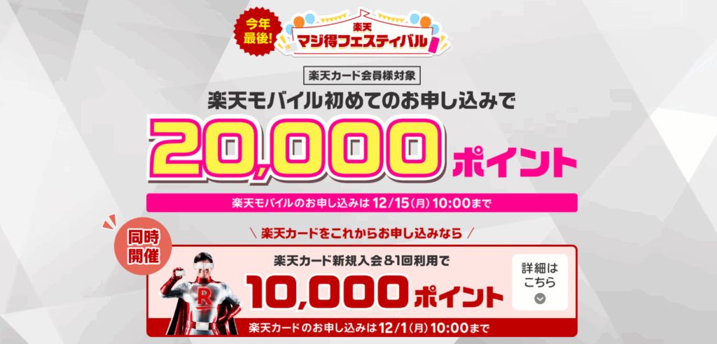 【12/15(月)10時まで】楽天カード会員がRakuten最強プラン初めての申し込みで20,000円分のポイント還元☆楽天カード新規入会&1回利用で10,000円分のポイント還元も。楽天モバイル