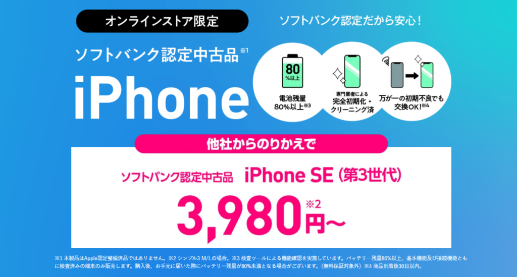 【特価】ソフトバンク認定中古品のiPhone SE(第3世代) 64GBがMNP一括3,980円~、128GBがMNP一括15,660円~。ワイモバイルオンラインストア