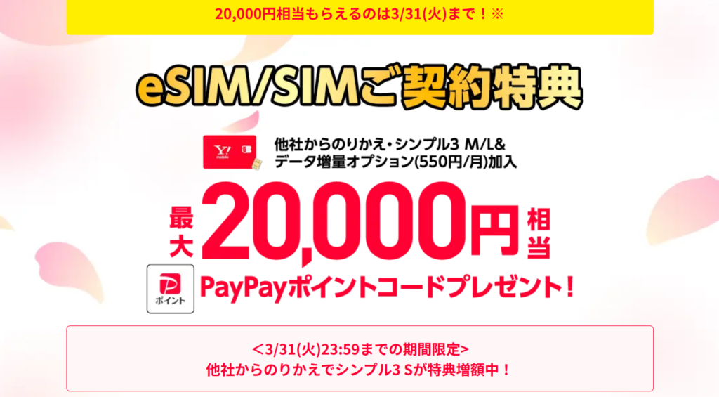【3/31(水)まで】SIMのみ契約で最大20,000円分のPayPayポイント還元と3ヶ月間無料トライアル企画が今月末で終了となります。ワイモバイルオンラインストア