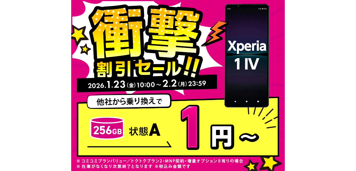| NEW 【衝撃セール】Xperia 1 Ⅳ 256GB(状態A)とがMNP一括1円~、Google Pixel 8 128GB(未使用品)がMNP一括14,300円(税込)~、Xperia 5 Ⅳ 128GB(状態A)が新規一括1円~ (※在庫切れの状態が多いですが、午前中を中心に在庫復活しているタイミングがあるのでこまめにチェックしてみてください) | 2026年2月2日まで |