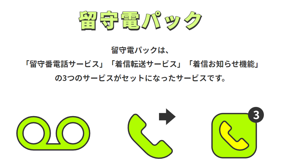 留守電パックは『留守番電話サービス』『着信転送サービス』『着信お知らせ機能』の3つのサービスがセットになっているオプション。