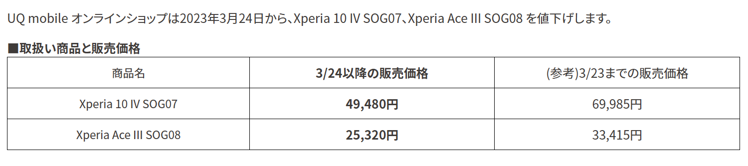 Xperia 10 ⅣとXperia Ace Ⅲは、2023年3月24日から大幅に値下げされているので、お得感が強いですね。