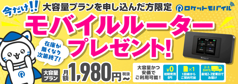 大容量プランの契約で無料でモバイルルーターがもらえるプレゼントキャンペーンも開催中です。