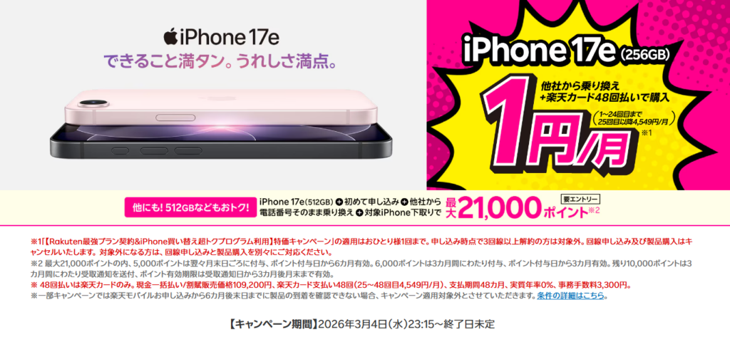 さらに今なら、2026年3月に発売されたばかりの『iPhone 17e 256GB』が月1円~で購入できます。