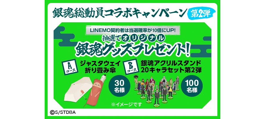 月替わり特典は、 銀魂オリジナルグッズが当たる『LINEMO 銀魂総動員コラボキャンペーン 第2弾』。