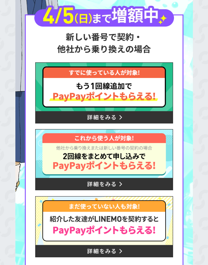 『LINEMOおかえりだモンキャンペーン』『2回線まとめて申し込みでPayPayポイントプレゼントキャンペーン』『契約者向け!追加申込キャンペーン』『LINEMOベストプラン紹介キャンペーン』のキャンペーン特典も増額中です。