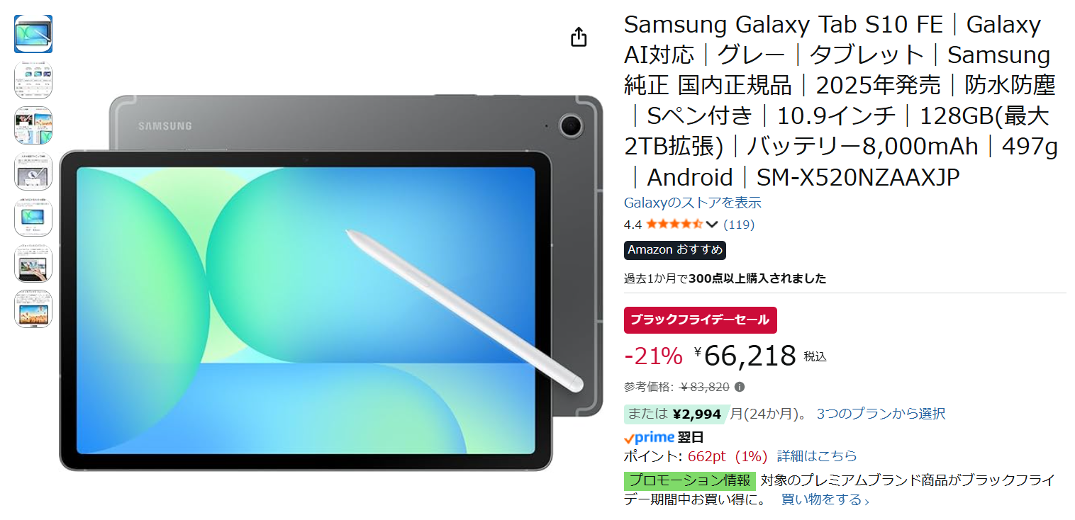【Amazonブラックフライデーセール】Galaxy Tab S10 FEが21%OFFの66,218円(税込)、Galaxy Tab A9+が34%OFFの23,682円(税込)!!過去最安値の特価プライス