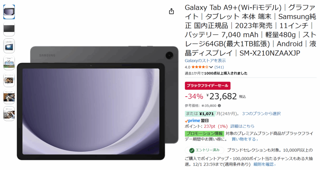 Galaxy Tab A9+も、Amazonでの過去最安値になっています。
