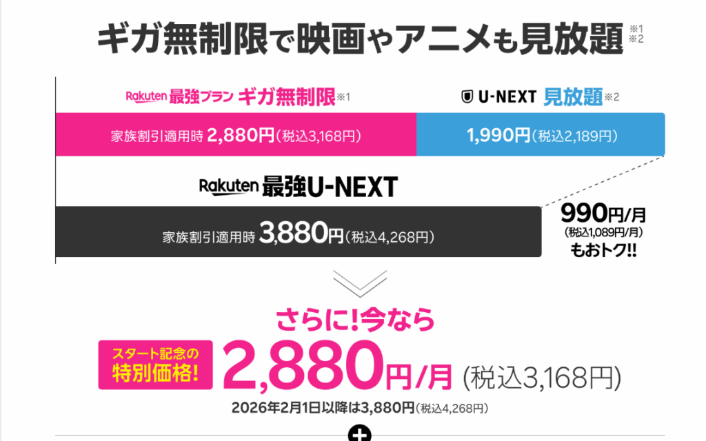 【ギガ無制限で映画アニメ見放題】Rakuten最強U-NEXTが2026年1月までは1,100円割引の月額3,168円で利用できるリリース記念キャンペーン☆楽天モバイル