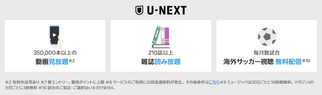 35万以上の映画/ドラマ/アニメなどが見放題、210誌以上の雑誌も読み放題、海外サッカー/ゴルフ/格闘技/野球/テニス/卓球等のスポーツ配信もあります。