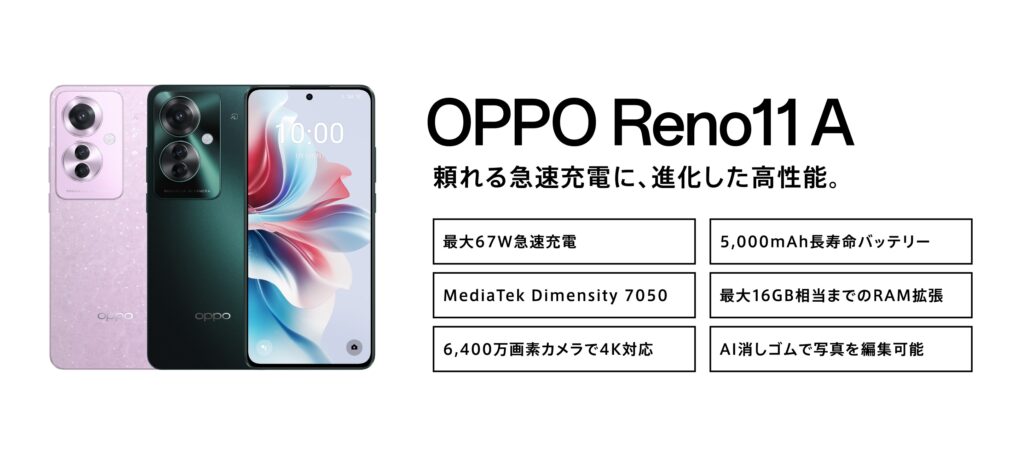 • OPPO Reno11 A:実質32,062円(税込) ※ 27%OFF / ポイント10倍