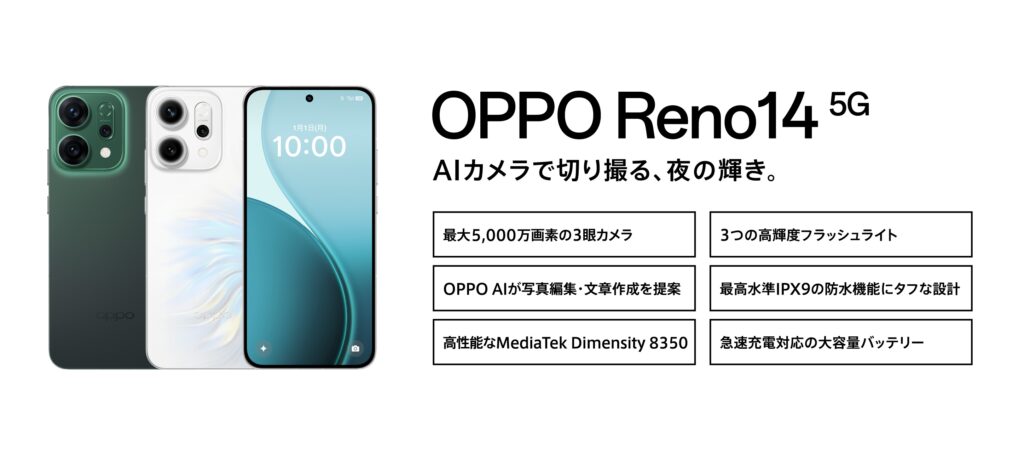 2025年7月に発売された『OPPO Reno14 5G』は5%OFF&ポイント10倍で実質68,229円(税込)、専用マグネットケースも付いてきます。