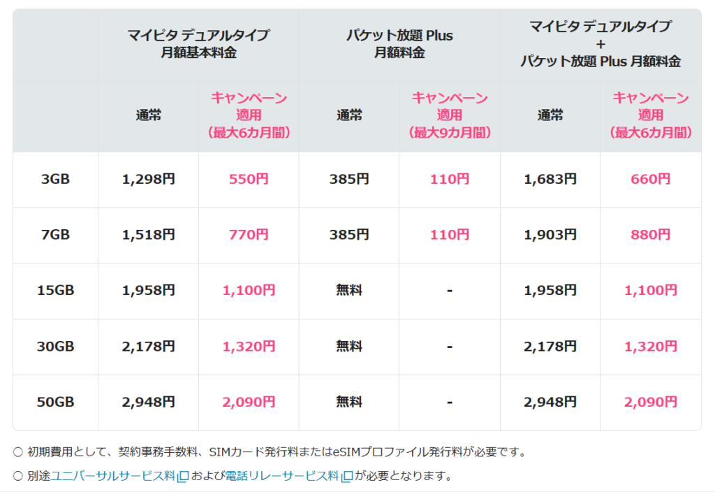 2つのキャンペーン特典を合わせると、3GB/7GBプランは最大6ヶ月間 月額1,100円割引になります。