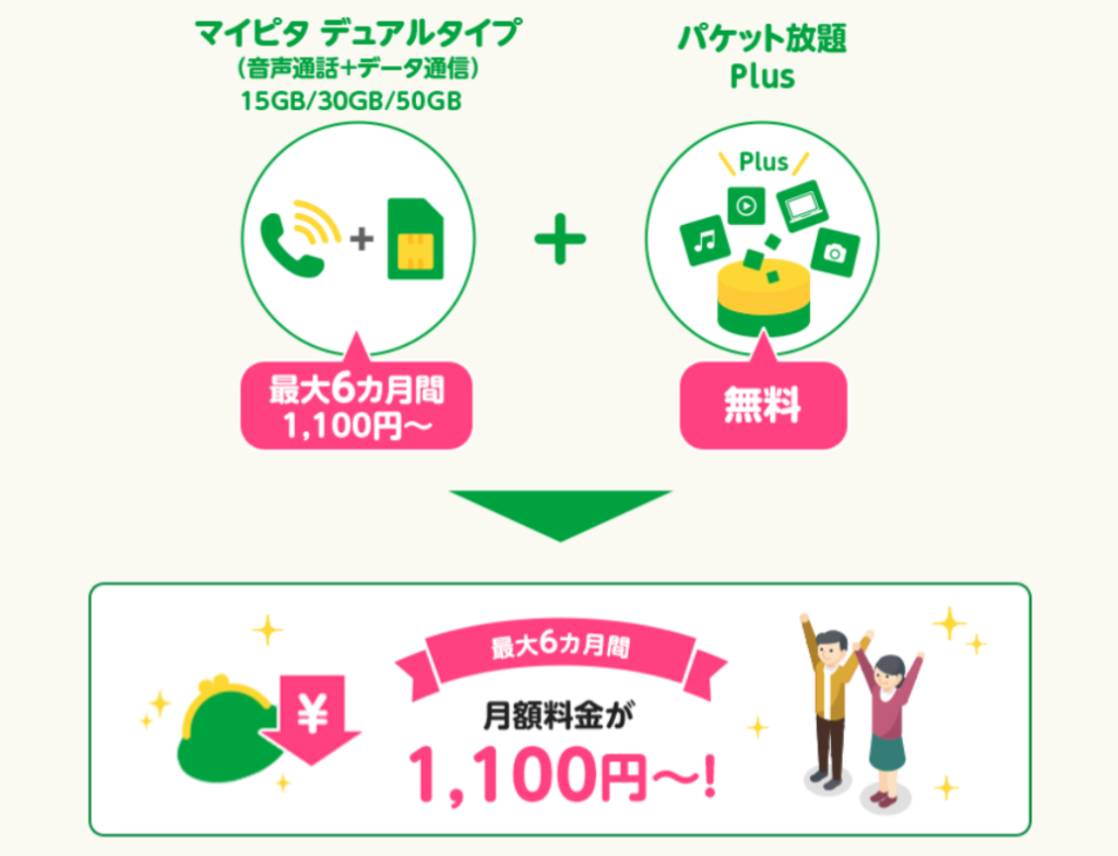 - マイピタ デュアルタイプ(音声SIM)の契約で、最大6ヶ月間 月額748円~858円割引